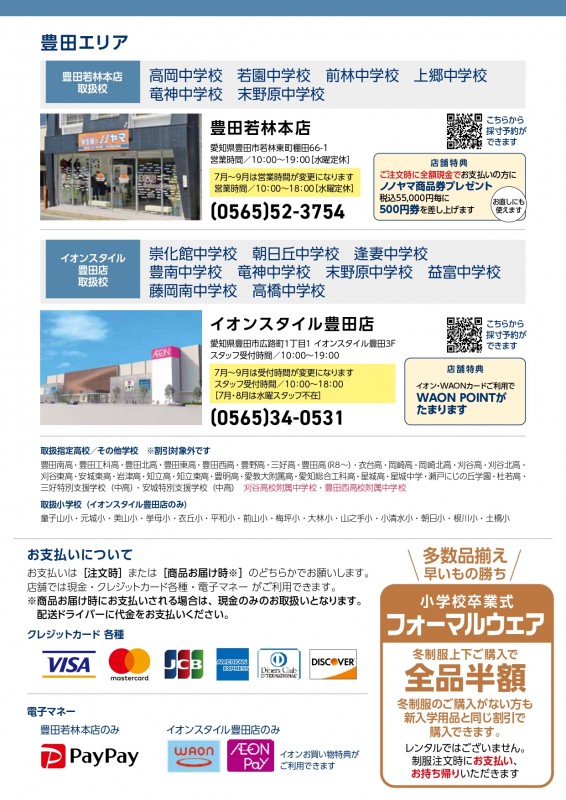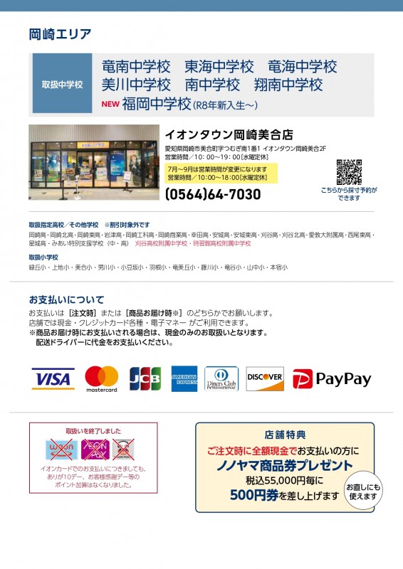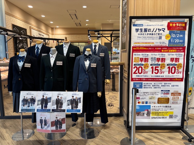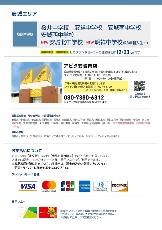 新しくアピタ安城南店で安城北中学校・明祥中学校、イオンタウン岡崎美合店で福岡中学校の制服体操服等を取扱開始。