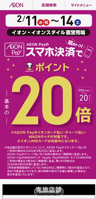 AEON Payを利用したお買物でWAON POINTが基本の20倍|イオン